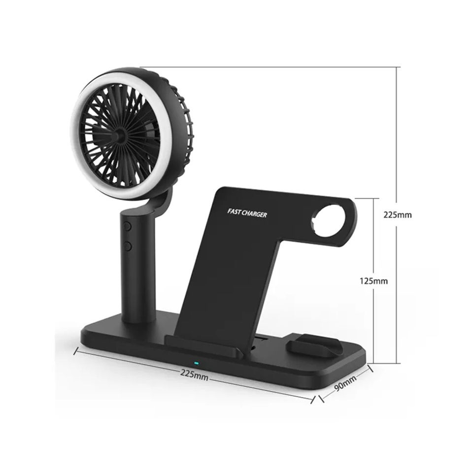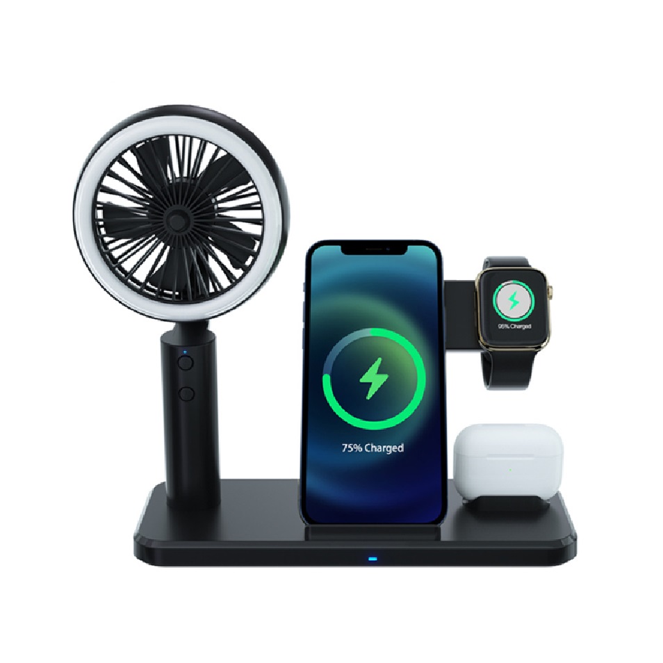 -Features: *1:15W fast wireless charger, compatible with 10W, 7.5W, 5W*2: hand-held small fan (the product does not contain batteries)*3: small night light*4: charging port for AirPods*5: bracket for wireless charger (for iWatch).(This product does not include wireless charging for iWatch, only the bracket)